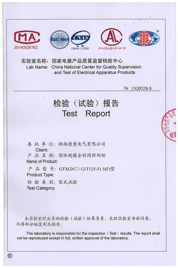 GTXGN□-12/T125-31.5(F)固體絕緣全封閉環(huán)網(wǎng)柜試驗報告