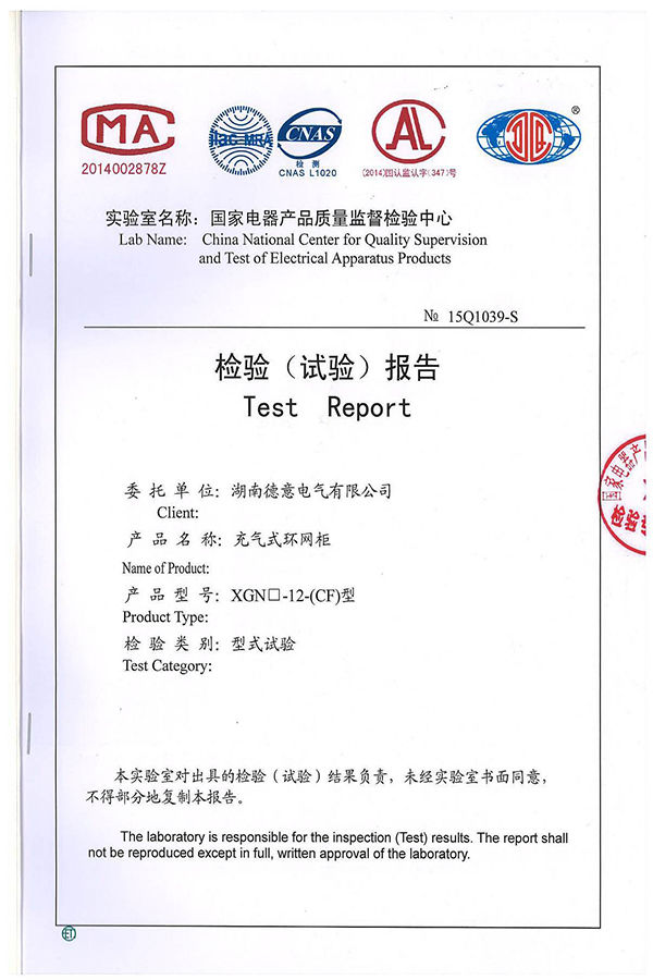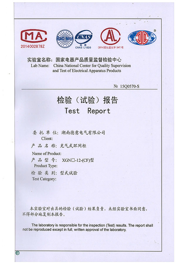XGN□-12(CF)型充氣式環(huán)網(wǎng)柜試驗報告
