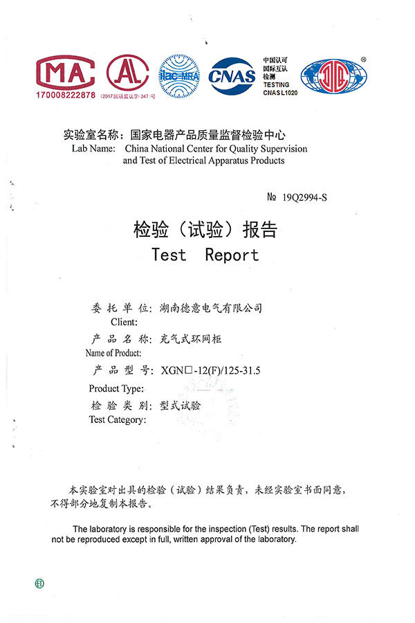 XGN□-12(F)/125-31.5型充氣式環(huán)網(wǎng)柜試驗報告
